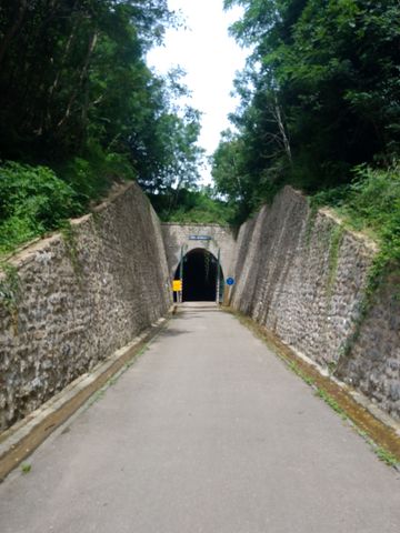 Nous pouvons aussi noter auparavant, la voie verte qui emprunte un long tunnel ex-ferroviaire, mais à vélo, de nouveau un sentiment étrange (et trop de fraîcheur). Le tunnel du Bois Clair, avant Cluny (presque le long de l’A6), visiblement le plus long d’Europe (1,6 km).