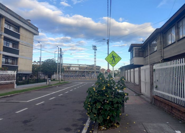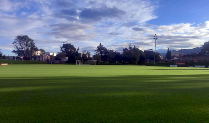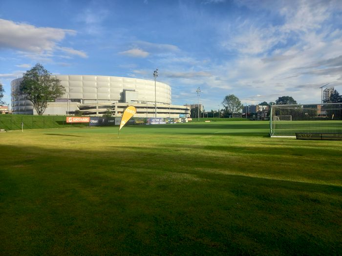 Premier (super) bon point, nous jouons à côté du Stade El Campin, au fameux Campincito. Ce que fait que je dois partir à la même heure (6h) mais je m’y rends à pied dans un Bogota pas encore réveillé… et retour sous le soleil sur la ciclovia de la Septima. Un tout autre plaisir que sauter sur la moto dans le froid du matin.