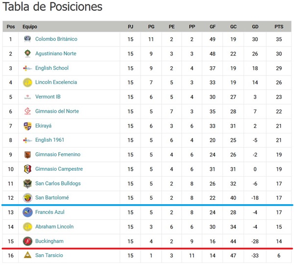 Un espoir de doubler le Gimnasio Feminino, qui recoit le leader; nous pouvons rejoindre San Carlos Buldog si ils perdent, mais nous resterons derrière au Fair-play. Et enfin un match qui ne nous arrange pas, San Bartolomé-Buckingham, à moins d’un nul. Et puis il a le fair-play: outre un hypothétique pe+étage deplombs de notre part, cv4est surtout la situation de l’Abraham Lincoln qui nous inquiète, car si ils passent dans les 2 derneirs (du classement Fair-play), ils « libèrent » une place de barragiste supplémentaire! En résumé, compliqué d’extrapoler!