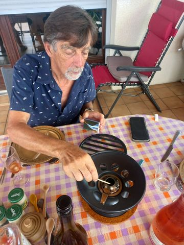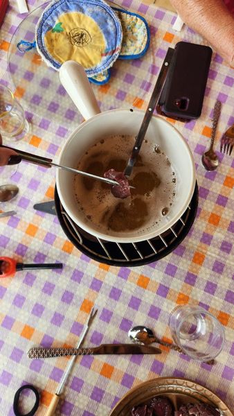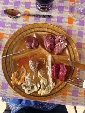 Car niveau gastronomie la barre a été placée haute dès le 1er jour: avec une fondue aux 3 viandes (boeuf, chevreuil et sanglier)! Bon les caclons n’ont pas servis depuis très longtemps et l’allumage est délicat!