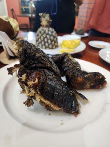 Et puis, malgré la réputation et la situation du pays, pas de soucis pour manger, même parfois dans des restos gastronomiques! Ludo admirera le morceau de …. crocodile, qui lui rappellera peut-être son plat de varan du Cameroun.