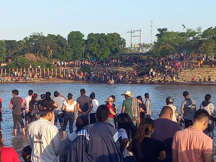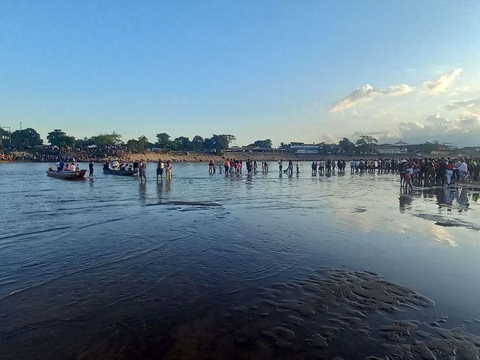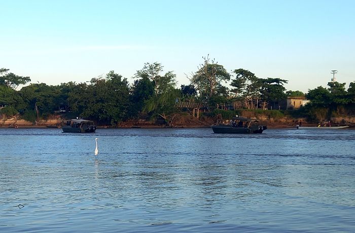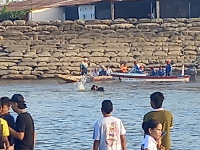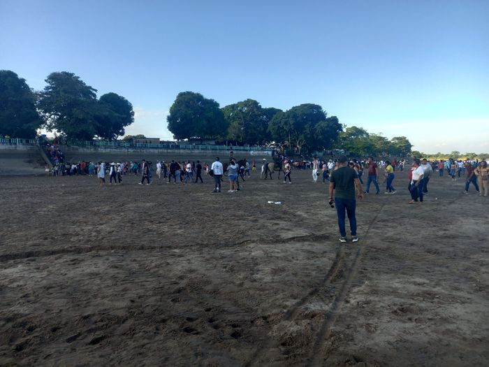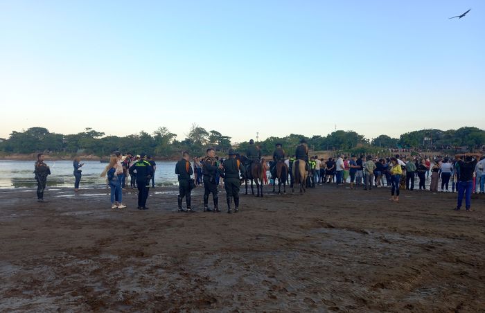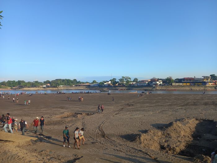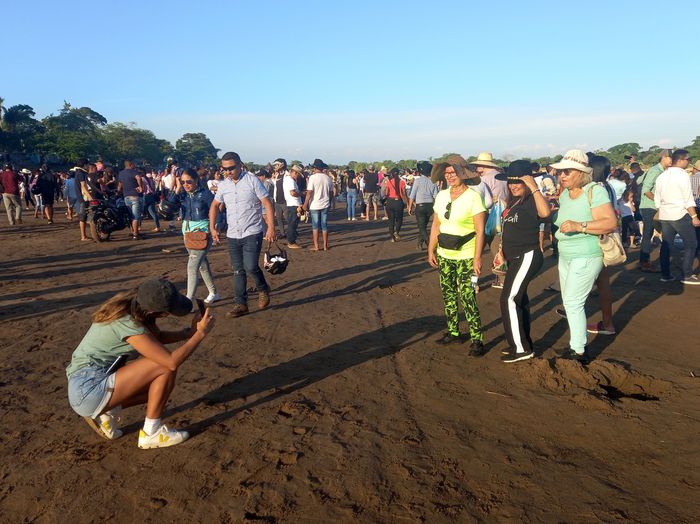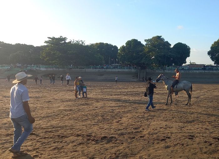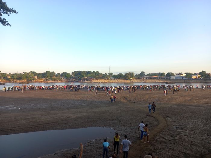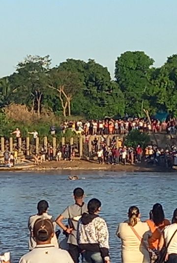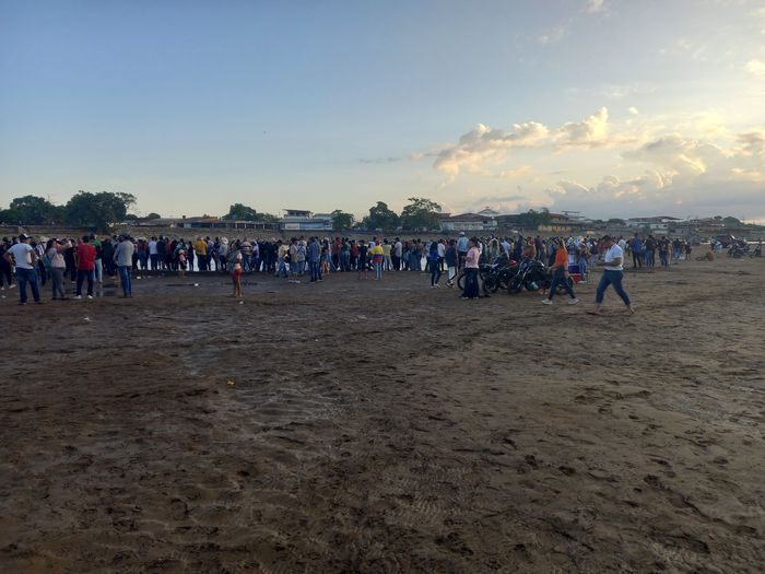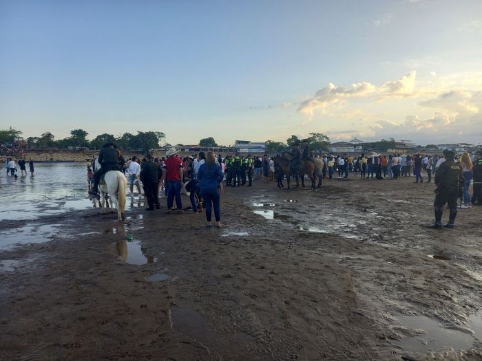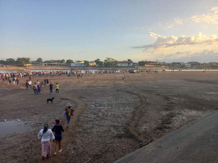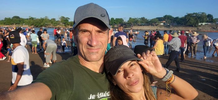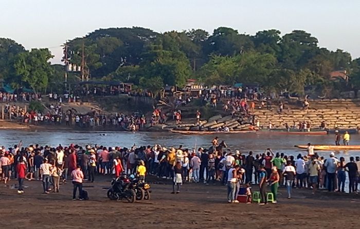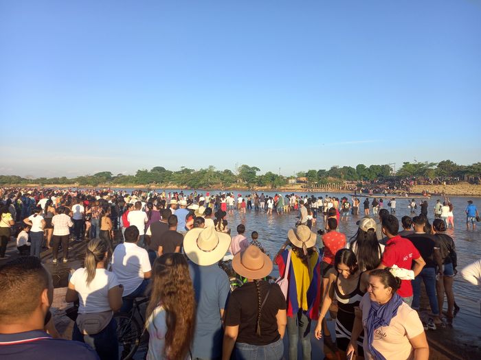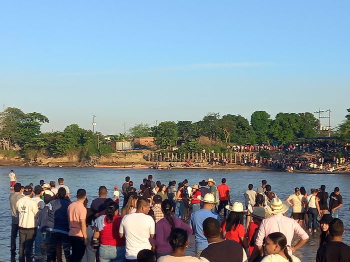 Donc une partie des spectateurs, plus ou moins (enfin plus que moins) se dirige vers la berge colombienne du Rio Arauca, et regardent et encouragent les cavaliers qui traversent le fleuve à la nage et … à cheval, depuis la berge vénézuélienne!