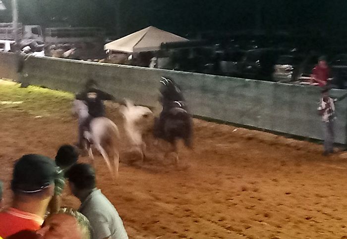 Et la compétition se joue avec un décompte de points. En gros, cette longue piste de 300 mètres possède 3 zones: la premiêre, la seconde et la zone morte. Dans chaque équipe, un des cavaliers est un aide et l’autre le principal acteur du jeu. Ils prennent place au dèbut de la piste dans la zone 1m, puis on lâche une vache. Objectif, une fois que celle-ci a pris de la vitesse, sentant que son échappatoire se situe 300 mètres plus loin (où talonnée par l’adjoint), l’objectif est de l’attraper par la queue.