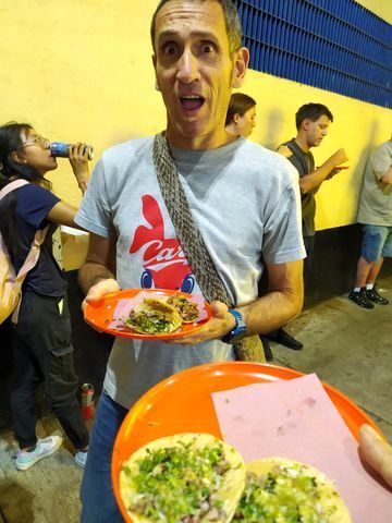 Donc les billets achetés sur internet dans la journée, nous avons la chance de pouvoir nous rendre à la séance à pied, l’Arena Mexico où se déroule la soirée est assez proche de notre hôtel. Et avant d’entrée, au milieu des stands proposant cagoules et t-shirt, nous avalons un tacos vite fait!