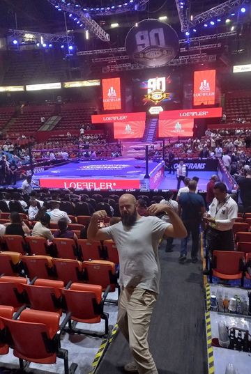 On entre donc…. on aperçois certains combattants en séance photos…. et on s’immortalise devant le ring, avant de trouver notre siège et de se réhydrater!