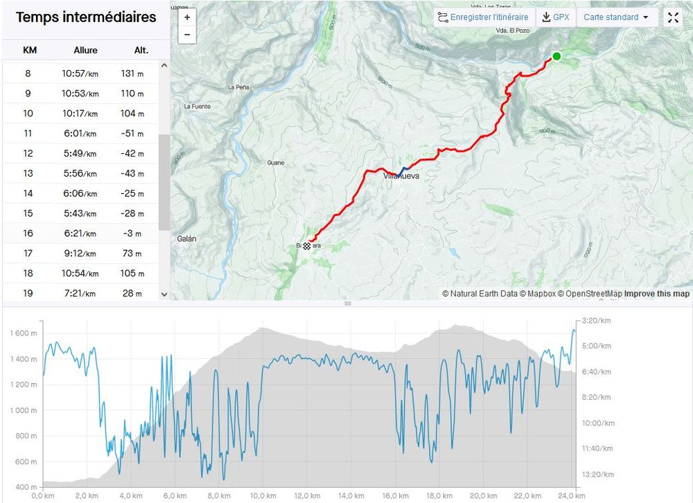 Très compliqué de faire une projection! J’avais couru le medio-naraton en 3h40 l’an passé. Ah non on me glisse dans l’oreillette que mes souvenirs ne sont pas bons: 3h10 pour les 24,2km et 1600 de D+. Mais à bloc et avec un genou en délicatesse. En me basant sur ces chiffres, je table donc sur plus d’économie physique dans cette première partie. Disons 4h00 3h45 serait bien.