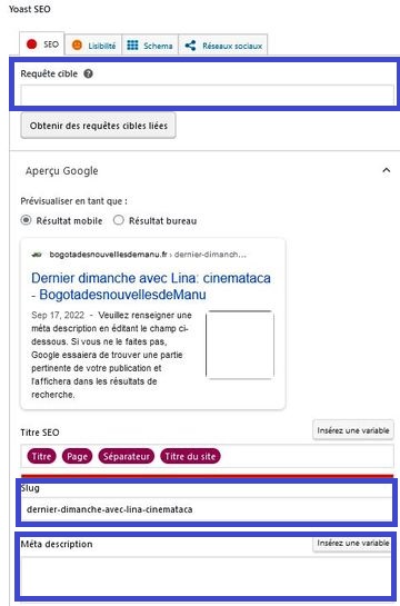 Je vais donc m’attaquer à une très lourde opération, celle d’indexer ces 2600 articles…. Je vais y aller pas à pas…. car c’est chronophage (5 minutes par article en gros): il faut rédiger une requête (en gros les mots que pourraient taper un internaute dans un moteur de recherche)…..créer un slug (ce qui s’affiche dans la barre d’adresse pour définir cet article) et le résumé qui apparaît dans les résultats sur la page de recherches!