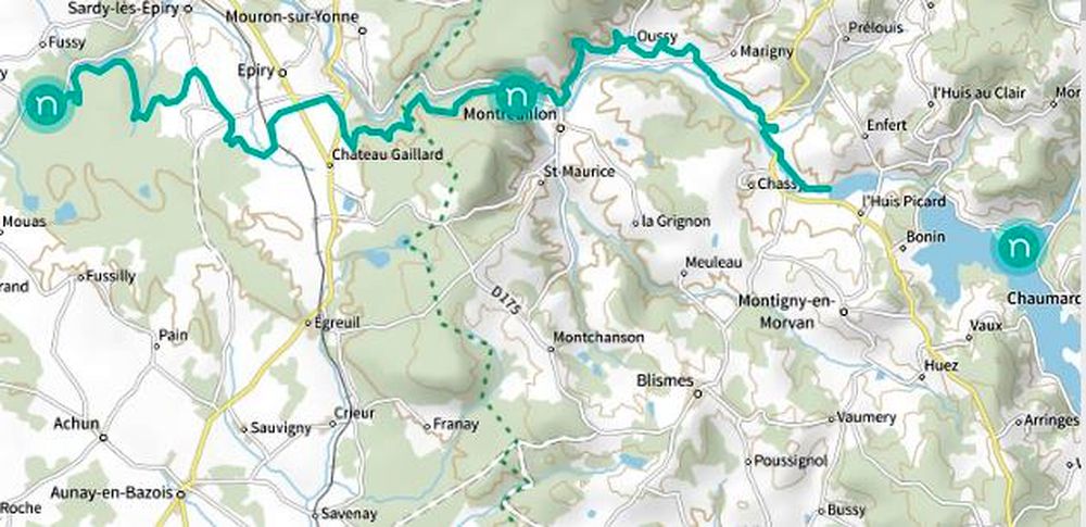 Depuis 1949 et l’achèvement du lac, elle part de Pannecière, et descend 250 mètres de dénivelé sur 25km. Et tu peux la suivre, normalement en VTT mais j’ai tenté le coup avec mes sacoches! Au petit matin, sous le feuillage, avec la lumière et malgré une piste technique et très boueuse, ou encore une biche qui tombe à l’eau parce qu’aussi effrayée que moi… un superbe moment. Je la récupère en bord de route, 1 km après mon départ du camping du Lac. Puis elle quitte la route pour suivre la courbe de niveau.