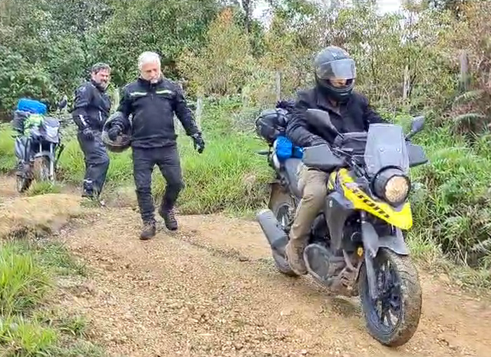 Le plus complexe ce sont finalement les 300 premiers mètres pour rejoindre la piste principale depuis le terrain de Davina! Je ferais finalement 3 voyages, avec les 3 motos pour les mener en bas pour affronter ce mélange de boue glissante, de pierres apparentes, et d’ornières.