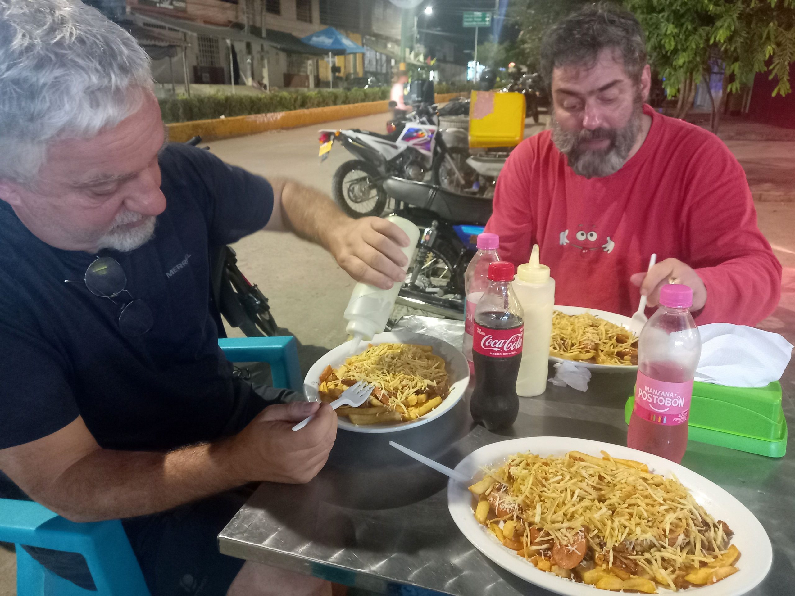 Dernier repas, un autre incontournable d’un road-trip moto réussi, la salchipapa. De fort belle qualité, celle de Mauro!!