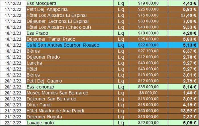 16,77€ de carburant, 40,01€ d’hôtel (dont 2 avec petit-déj inclus), 43,14€ de nourriture et boissons et 15,80€ de loisirs (tour en lancha, achat de café et musée) soit un voyage de 5 jours pour 125€.