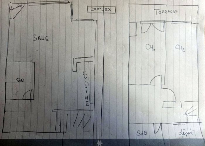 Je t’ai donc (mais aussi pour moi, afin de réfléchir un peu où mettre tous ces meubles dont j’ai du mal à me rappeler qu’ils m’appartiennent) tracer un croquis. En 2 morceaux puisque c’est aussi un duplex!