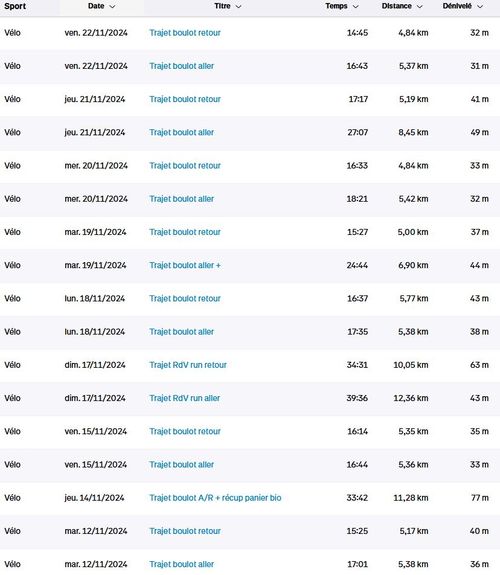 Et pour le vélo, même si la liste est plus longue que d’habitude, pas plus de kilomètres, j’ai juste saucissonné, restant plus souvent au lycée, j’enregistre les allers et les retours séparément.