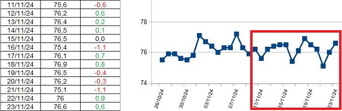Dans cette rubrique, croisons les doigts, il y a rarement autre chose que ma courbe de poids! Qui a été durant les premiers mois (septembre/octobre) assez plane autour de 75,5 kg! Mais là cela devient n’importe quoi au jour le jour: parfois 75, parfois 77…. Incompréhensible!