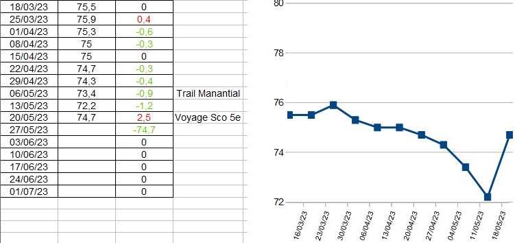… on peut faire un bilan de mon poids, après une dernière semaine de nourriture en voyage scolaire.La nourriture était moins abondante que lors des dernières expériences de voyage, l’opération +3kg a échoué!