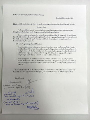 Manu qui écrit une lettre officiel signée par pas mal de collègues, car nous sommes nombreux à ne plus avoir de documents d’identité colombiens (carné diplomatico, cedula extranjera ou surtout permis de conduire valide) juste pour avertir notre direction de la situation… au cas où (et tu me diras, ça commence à me connaître ces démarches….)!