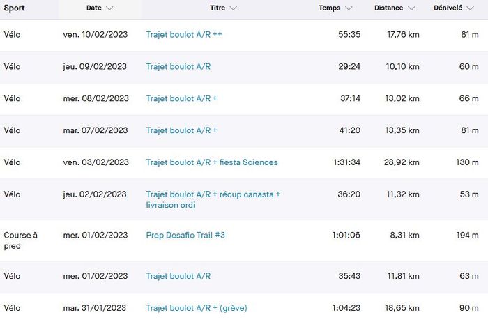 Du vélo évidemment, pour mes trajets vers et depuis le lycée, avec un jour notable, le jeudi 3 février, jour sans voiture et avec détour: récupération de mon panier bio au local de la Finca en la Nube et le dépôt de l’ordi de Chan chez lui (ordi que j’ai justement récupéré au local).