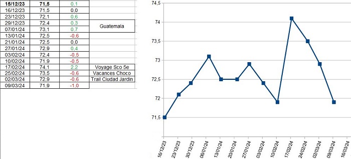 Genou de mieux en mieux, donc on se recentre sur le poids! Après une subite prise de poids, explicable par le voyage scolaire (moins d’activités physiques et plus de goûtés)… la décrue est de nouveau en marche.