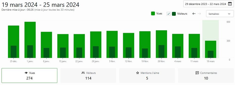 Il a pris un rythme de croisière, avec des semaines assez régulières: en moyenne 400 pages vues par, entre 150 et 200 visiteurs.