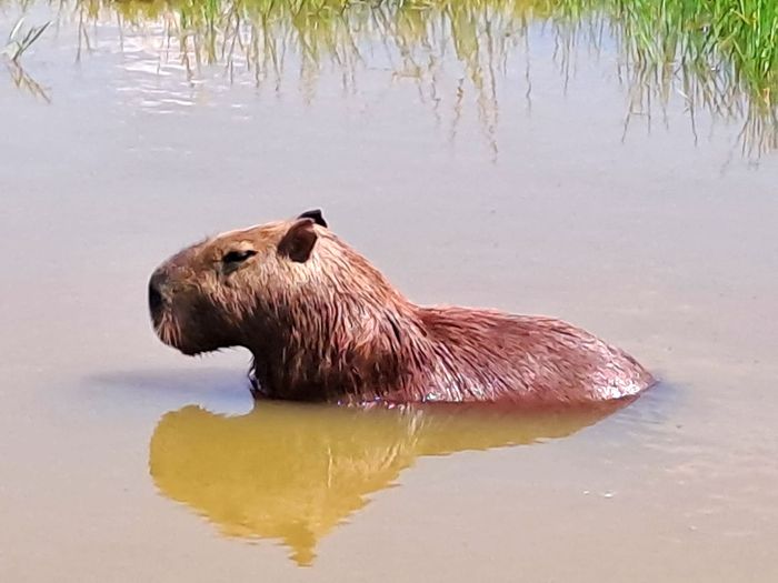 Les stars du lieu, ce sont les chingüiros (appelés ainsi en COlombie) mais connus internationalement sous l’appellation Capibaras. Disons un mix entre une marmotte, un castor et un cochon. Que l’on aperçoit, pépouses, dès le chemin d’accès de la ferme!