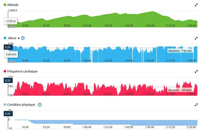 Un peu déçu, mon objectif de 2h20-2h30 est dépassé d’une minute, la faute principalement aux 50 mètres de D+ « oubliés » sur le parcours présenté, dans la rude montée du dernier kilomètre. Mais bon il y a encore du taf, j’ai tellement marché qu’à un moment je me suis cru en rando!