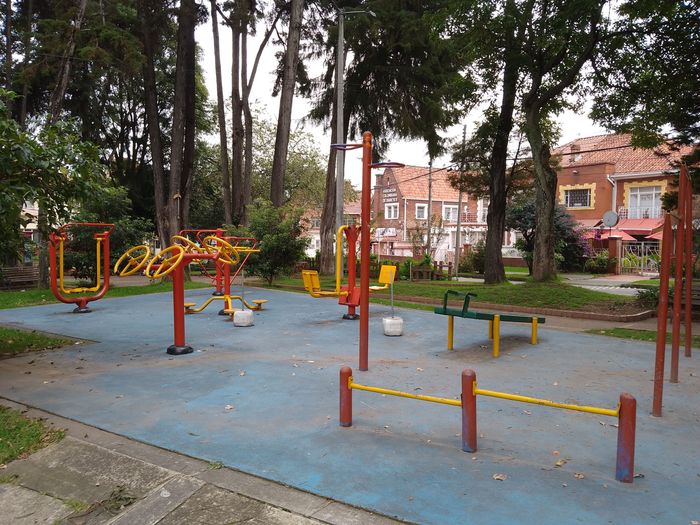 Niveau infrastructure, et bien c’est un petit parc colombien: une allée centrale bétonnée, quelques bancs, des appareils de sport public…