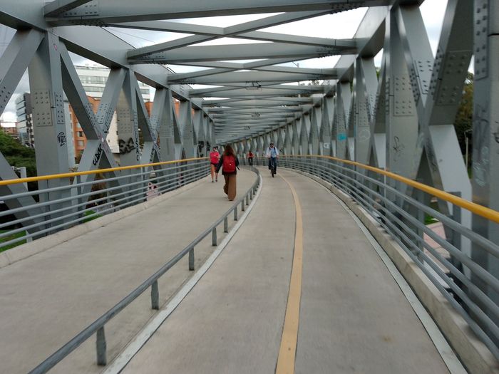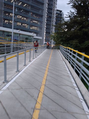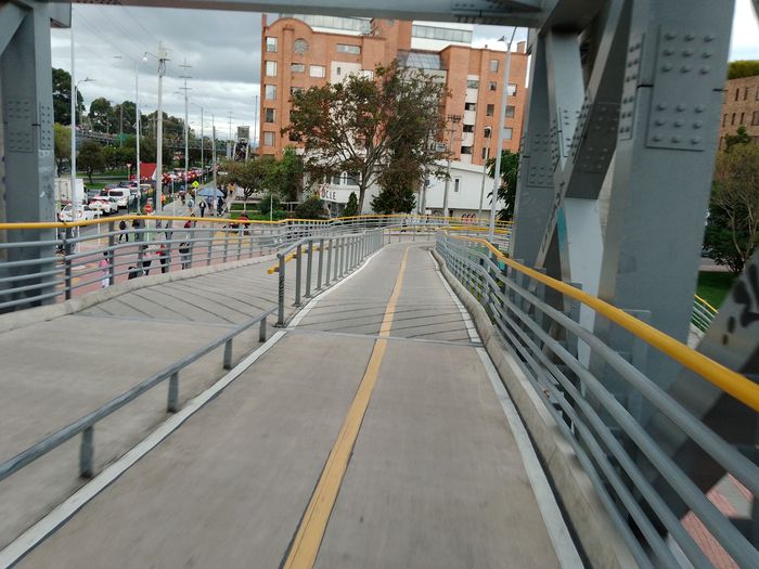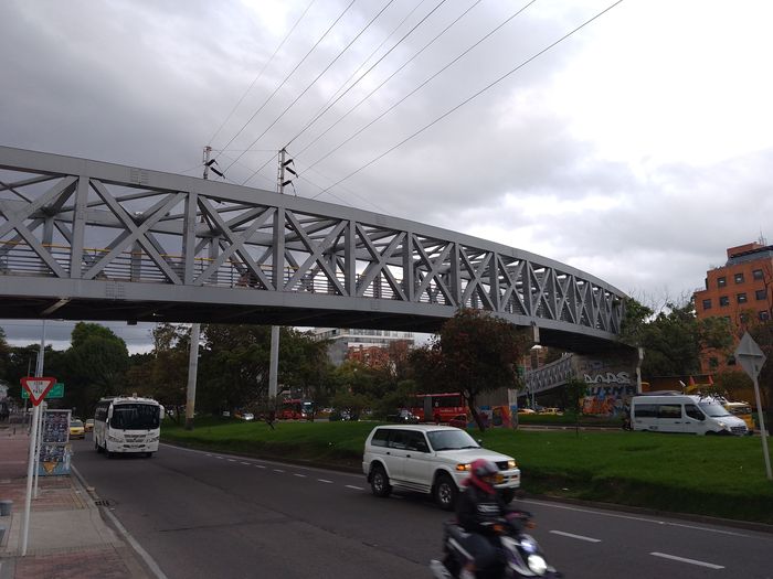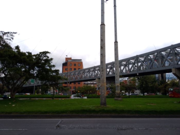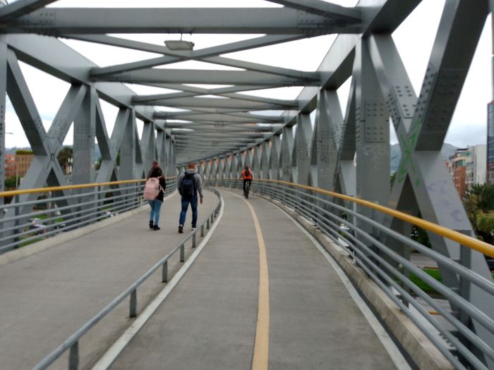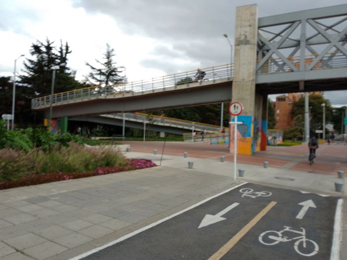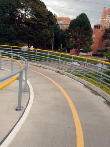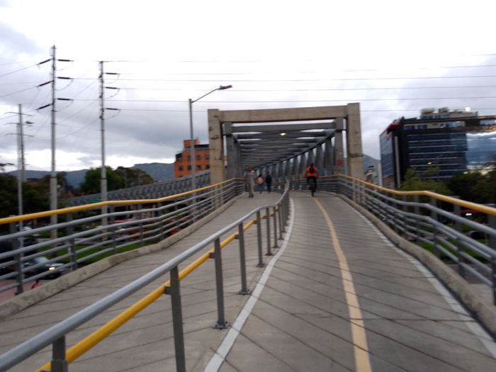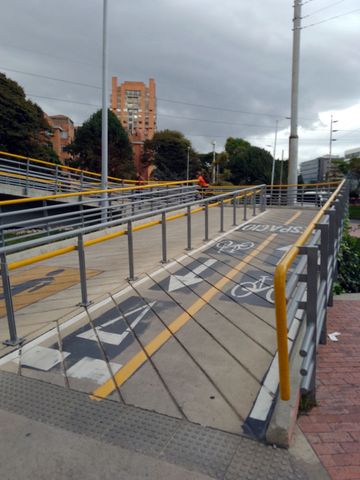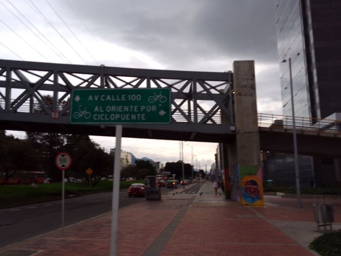 A Bogota, à vélo, tu rencontres souvent un gros problème, qui est de croiser les larges boulevards, tels la NQS, l’Autopista Norte, la Carrera Boyaca parmi tant d’autres. Il y a bien de nombreuses passerelles piétons, pas très large et à vélo tu es obligé de mettre pied à terre. Sauf sur la 111(calle) pour croiser l’Autopista Norte, le fameux Ciclopuente Canal Molinos, ou en V.F le Pont Cycliste de la 111.