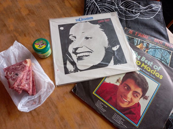 Tu commences à le savoir, en fait une visite au marché aux puces, c’est un combo: le combo disques-fromage de tête!