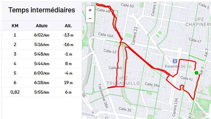 Donc 5 sorties course, mais une seule de plus de 10km (36K au total). Dont 2 sorties « utiles » (ou quand courir devient un moyen de déplacement, pour recharger ma carte de Transmilenio au Museo Nacional, ou retourner un produit Décathlon….). Ajoutons à cela 23 km de marche. Ainsi que du vélo évidemment!