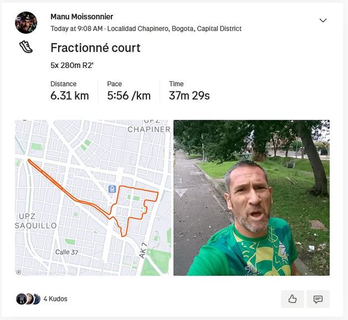 Et le lendemain du tempo, avec 4 fois 1km à 4:40/km sur la Ciclovia.