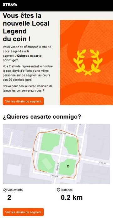 A noter donc que je deviens local legend (celui qui a pris le plus de fois ce segment dans les 90 derniers jours) du « quieres casarte conmigo? », le segment « veux-tu m’épouser? ».