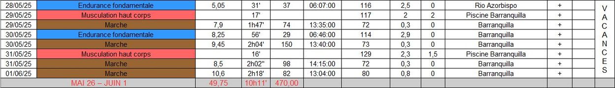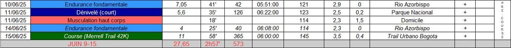 Soit juste après le Maratrail Merrell 2025, avec une semaine plutôt axée sur la récupération. Beaucoup de marche touristiques à Barranquilla, de l’aquagym à la piscine de l’hôtel et 2 runs en endurance fondamental. Le premier à Bogota en mode reprise, le second en mode touriste.