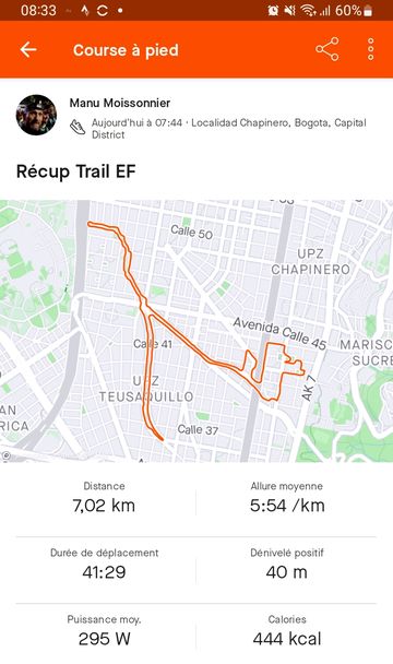 Le jeudi soir, histoire de profiter de la coupure d’eau pour prendre une bonne douche, 10 km avec échauffement, 5km à 5:10/km, allure que j’espère tenir sur les 32 de la Vuelta San Andres et quelques autres kilomètres de récup’. J’ai même créé un entraînement sur l’application Garmin. Bon non ce ne fut ni jeudi, ni vendredi pour cause de retour des fortes pluies sur la capitale colombienne! Mais samedi matin:
