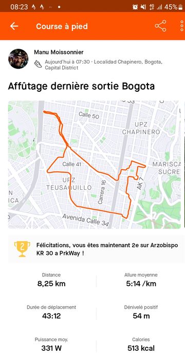 J’ai un peu varié des conseils de Mick: le vélo pour le boulot, encore 50km, pour faire tourner les jambes. Niveau course, un décrassage de 7-8 km le mercredi (avec cependant 3 fois 400m à bloc). Dernière et unique sortie de la semaine sur Bogota.