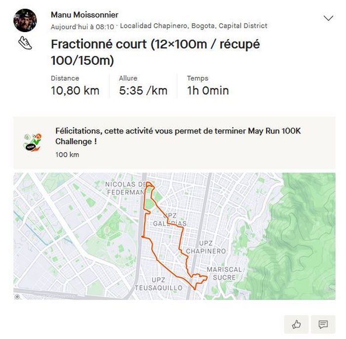 Et un petit tour sur mes terres du Parque Nacional le mercredi matin. tranquille mais avec un peu de dénivelé! En endurance fondamentale, c’est à dire en courant lentement pour ne pas dépasser 127 bpm de fréquence cardiaque. Ce qui n’est point facile finalement et oblige à courir très lentement!