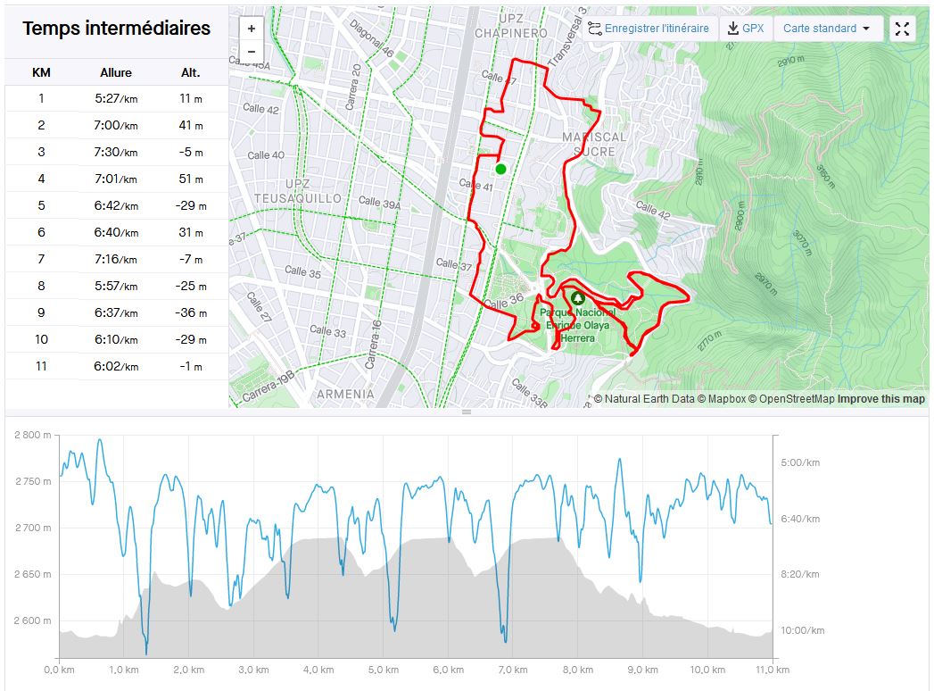 9 avril 2023: de retour à Bogota, un footing sur le plat, en essayant d’allonger la distance. Au final, plus de 15 km en 1h20.