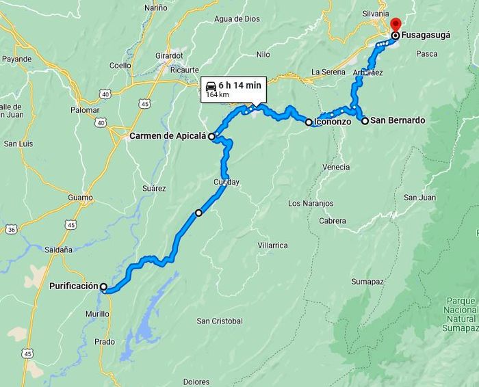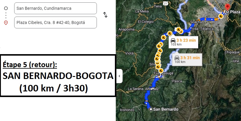 Et pour le retour, je laisse toutes les options ouvertes à tous, autoroute, Tatacoa, long détour, Sumapaz. Moi je voterais pour inclure au moins cette partie-ci.