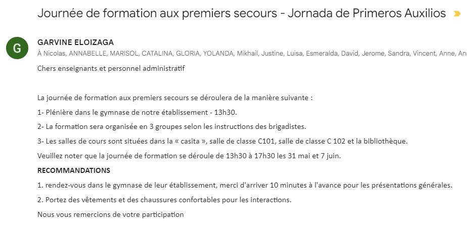 La loi colombienne oblige les entreprises en général et donc les établissement scolaires à former une grande majorité de ses employés aux premiers secours, et ce très régulièrement (trop), tous les 2 ans apparemment. Moi j’en suis à ma 3e formation!
