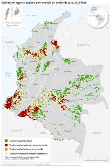 Une géographie mouvante, avec des zones de cultures qui se déplacent en fonction des interventions de l’armée ou encore les changement d’influence des dissidences de guérilla ou des groupes narcos.