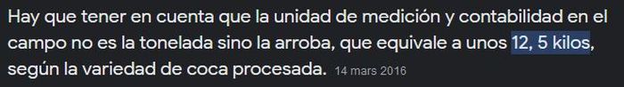 Avant de parler prix, il faut introduire une unité de mesure locale, visiblement propre à la récolte de feuilles de coca, l’arroba (à ne pas confondre avec le @robas):