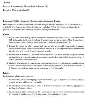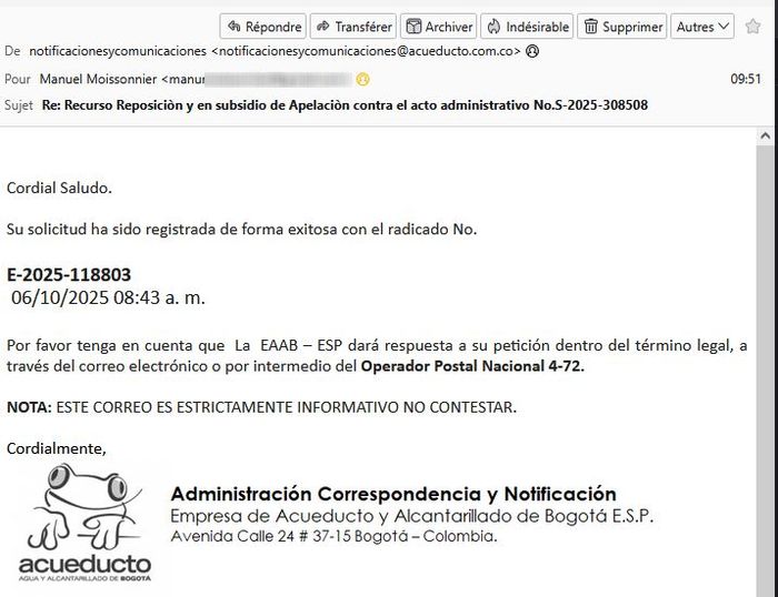 Lina, bien énervée, et avec son style de juriste, à rédigé une nouvelle lettre, dénonçant l’accord (unilatéral) d’Acueducto. Exigeant une conso de 0m3 quand personne ne fut dans l’appart et une facture finalement déjà payé par nous le mercredi.