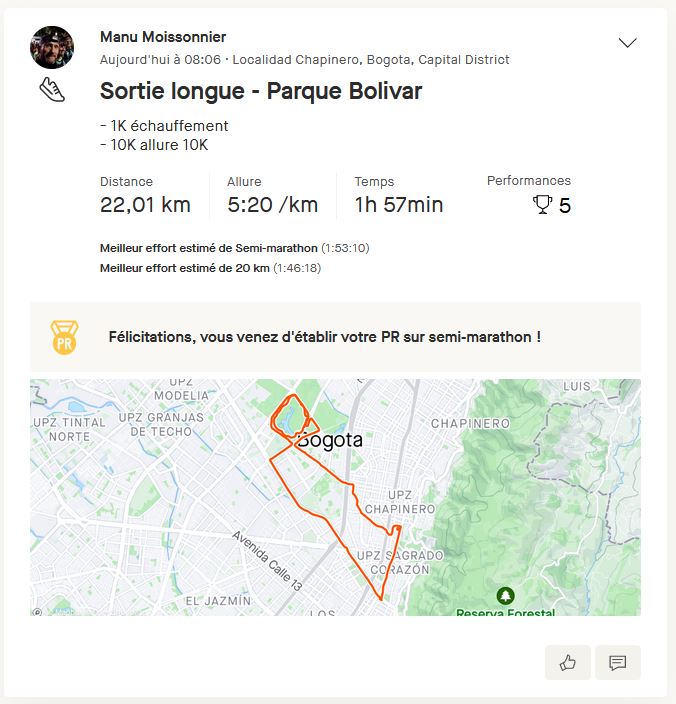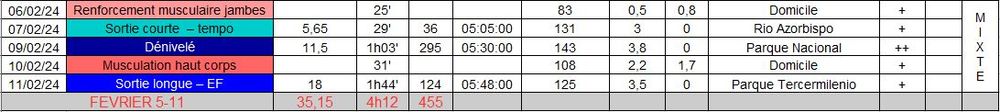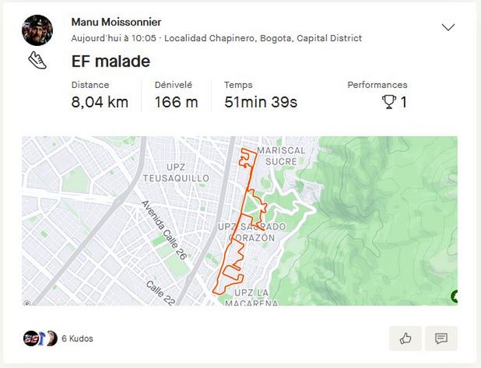Rajoutons la reprise du vélo (tronquée pour crevaison) et de la marche (pour visiter Fusagasuga par exemple) et voilà les bilans de la semaine!