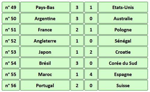 Voilà donc pour cette 2e semaine, qui s’arrête au milieu des 8e de finale! Or je crois qu’il n’y aura plus qu’un article pour tout le reste de la coupe du monde…. vu que le rythme des matchs va nettement se réduire!