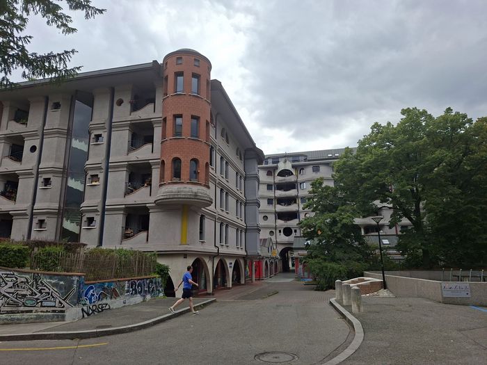 • Une architecture fantaisiste : les immeubles ne présentent aucune ligne droite. Ils sont faits de courbes, de vagues et de formes arrondies, donnant une impression de mouvement et de fluidité. Les balcons et les fenêtres suivent ces formes, créant un design très atypique et surprenant.