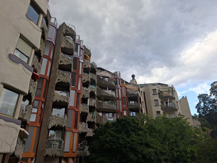 - Une architecture fantaisiste : les immeubles ne présentent aucune ligne droite. Ils sont faits de courbes, de vagues et de formes arrondies, donnant une impression de mouvement et de fluidité. Les balcons et les fenêtres suivent ces formes, créant un design très atypique et surprenant.