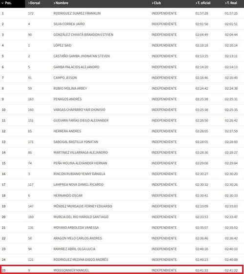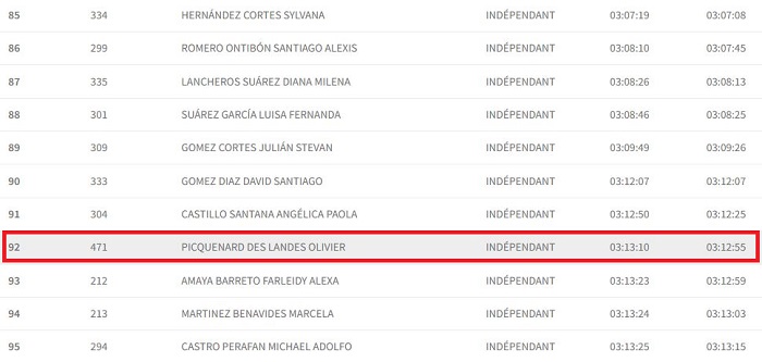Bon on va se calmer tout de suite: d’abord je suis à 30 mn du premier. Qui est un coureur de haut niveau puisqu’il a représenté la Colombie aux Championnats du Monde à Canfran en Espagne cette année.