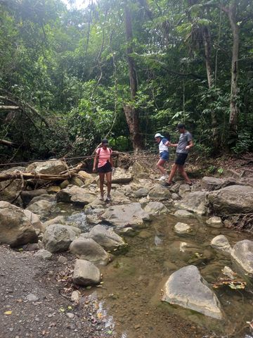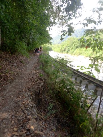 Arrivé à Tobia, il faut se changer (puisque nous allons baigner dans l’eau toute la journée) puis prendre un encas! Une randonnée qui commence …. en train!