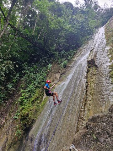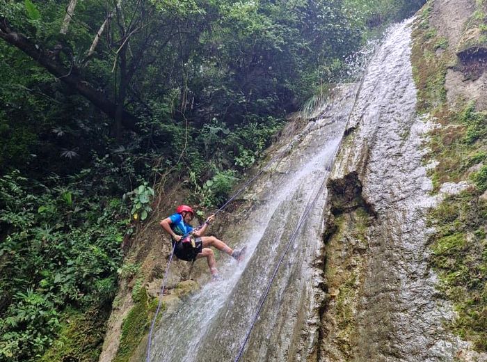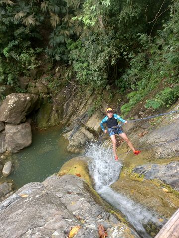 A partir de là, comment la redescente, en rappel donc et en deux fois, avec 2 cascades d’une vingtaine de mètres chacune. Harold, un des accompagnateurs, passe en premier… suivi des 18 élèves (et Cristihan au milieu).