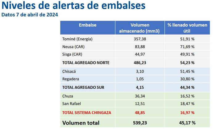 Mais les chiffres sont encore plus alarmants: 70% de l’eau de Bogota vient du paramo de Chingaza et de sa retenue d’eau, et elle est à peine remplie à 16% du niveau habituel à cette époque. Et les autres réserves ne sont pas bien mieux loties.