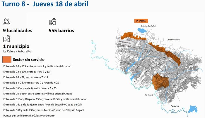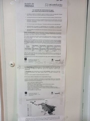 La solution adoptée par la ville, pour simplement limiter les dégâts est donc une restriction de l’alimentation en eau, quartier par quartier, pour 24h, à tour de rôle. Avec pour objectif de réduire la consommation de chacun, de peu, mais ce sont les petits ruisseaux qui font…. heu non pas vraiment! Concrêtement, remonter le % de réserve de Chingaza à 20% (actuellement 16.63%) et réduire le besoin d’eau de la ville à 15m3 par seconde (actuellement 17.39)